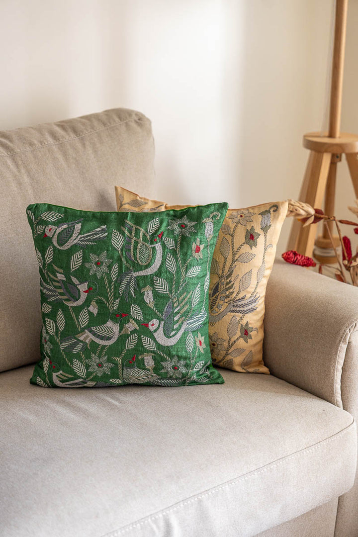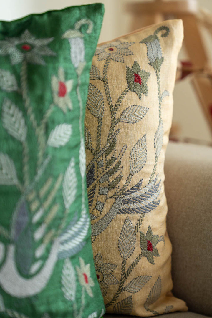 Add a touch of heritage luxury to your space with our exquisite Kantha-embroidered silk cushion covers, handcrafted with love.